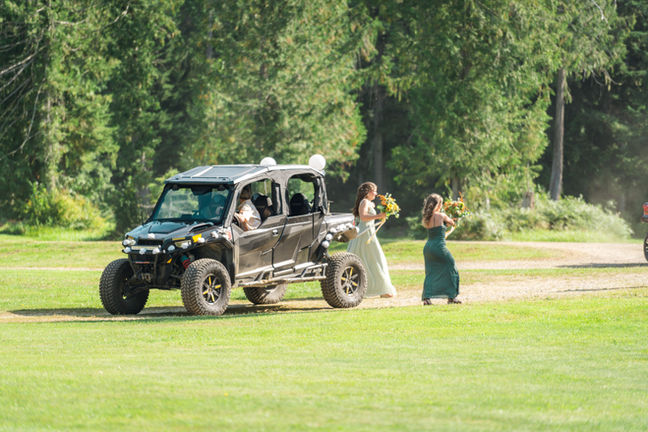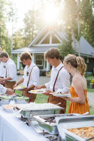The reception took place back at Ava's family cabin. Her family had spent almost the whole year prepping the lot beside theirs to host all of their guests RVs so they could stay nearby! There was a little "memory lane" guests could walk through to connect the two properties. 3 big tents took up the empty grass area, one of them covering the dance floor made out of their very own milled wood! There was a super cute mug wall as favours for guests, as well as a photobooth station and a bar and dessert stand also hand made by Silas.
