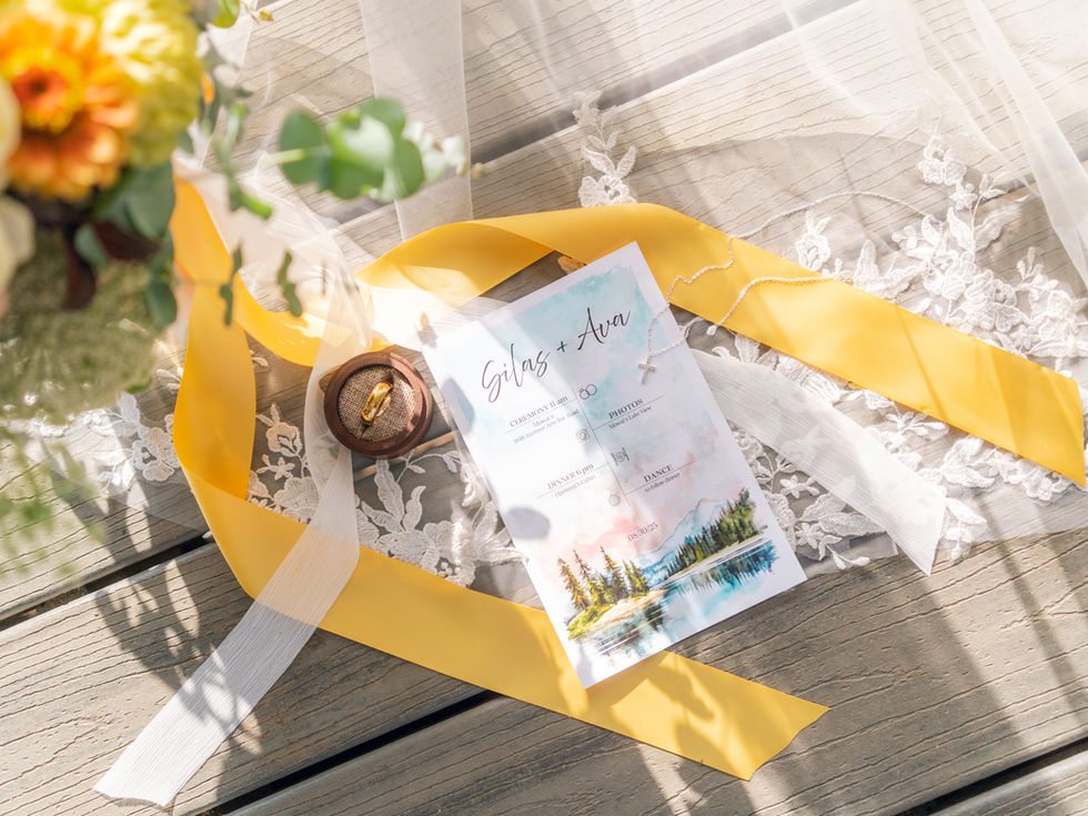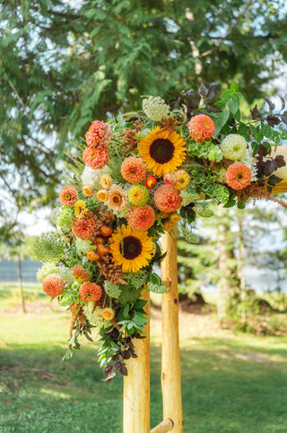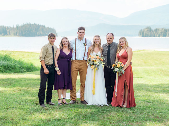 The ceremony took place at a beautiful property at the very top of the Shuswap Lake. Ava and Silas got married under an arch that Silas made himself, decorated with beautiful florals from @morning_glory_farm_florist filled with sunflowers, dahlias and zinnias. They had a live flute and guitar playing as they walked down the isle, two worship songs led by the bridesmaids, and a candle lighting unity ceremony.